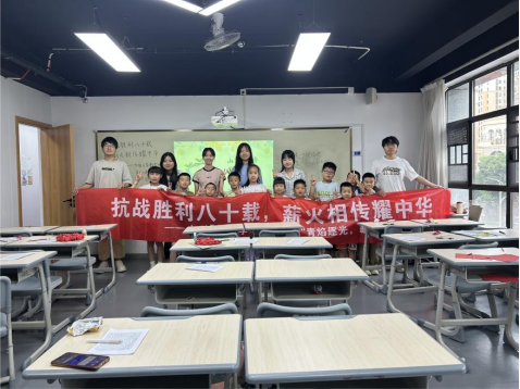 “青焰逐光,薪火相传”暑期社会实践宣讲团(临时团支部)走进长沙市图书馆联丰分馆,面向少年儿童成功举办了以纪念抗战胜利80周年为主题的“三下乡”社会实践宣讲活动。此次活动主要面向少年儿童,旨在通过生动的历史讲述和互动体验,向小朋友们普及抗战历史,弘扬抗战精神,厚植爱国情怀。