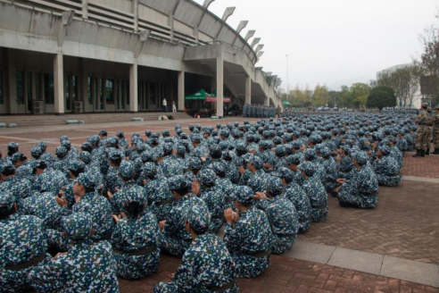 军训四营2025级新生全营会操在潇湘校区体育场外场举行。5个连队依次接受营长孙嘉伟检阅,各排长协助连长维持现场纪律。