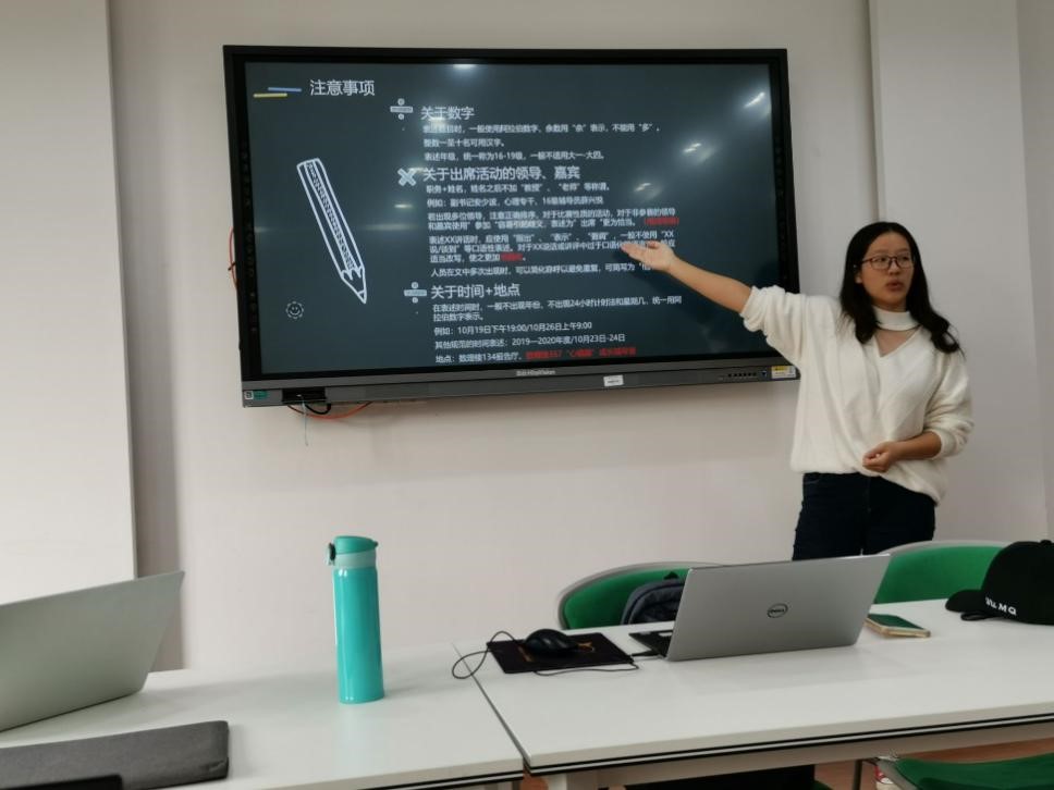 培训会开始前,副会长吴梦琦同学介绍了开展此次培训会的目的,即帮助干事们更全面地了解新闻稿的具体要求和写作方法,提高写稿、改稿的工作效率。接着,她详细讲解了新闻稿的特性、写法要点以及注意事项,并向干事们推荐了参考网站。最后,她以自身的经验指出写好新闻稿的核心途径是多写、多改、多思考,正是通过一次次的撰写、修改、比较,干事们才能提升撰写新闻稿的能力。