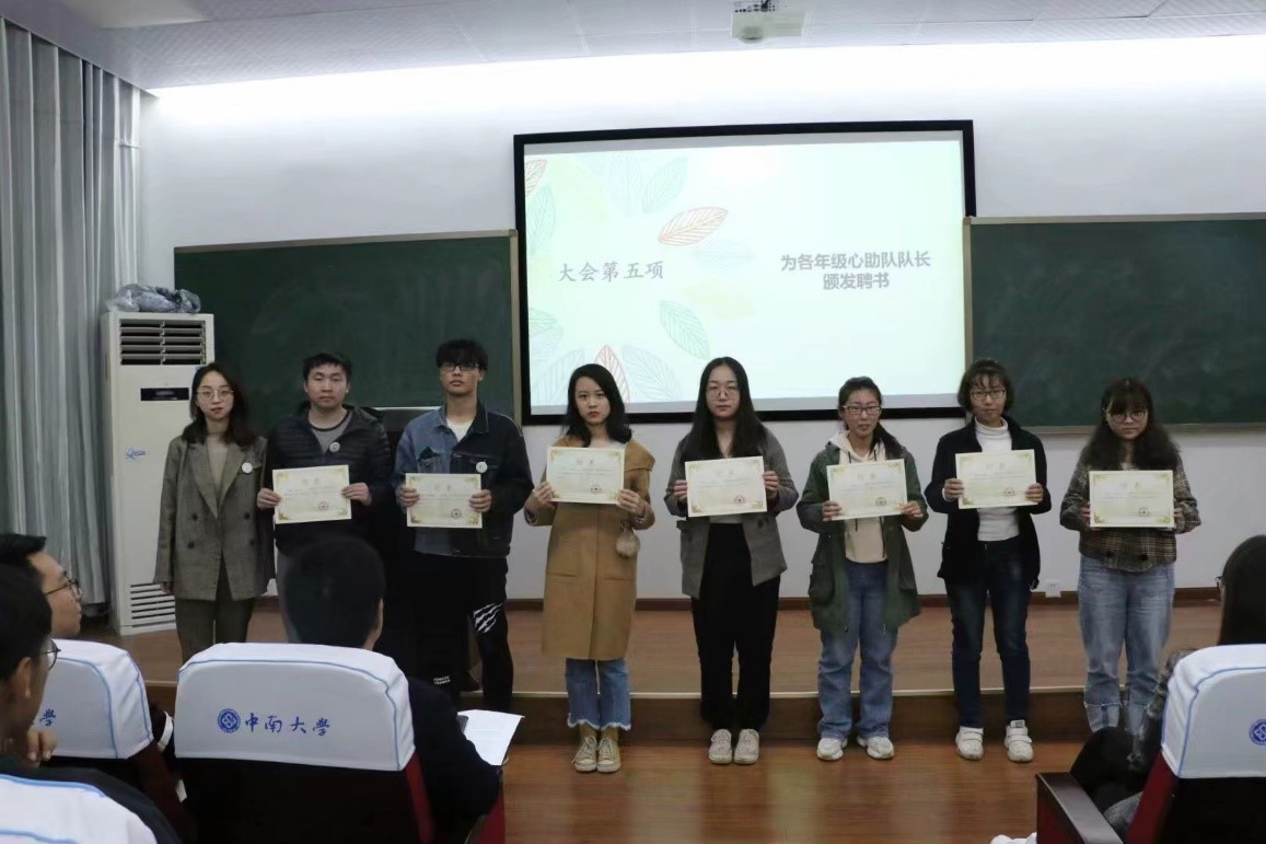 对心理健康工作的重视和建立的心理健康干预宏观体系,随即对爱游戏体育心理健康工作提出了几点要求,最后表达了对爱游戏体育心理健康工作的希冀。接着大会进行到第三项,由心助会培训部部长王雅洁同学带领全体心助队队员宣誓,响亮的宣誓声体现了心助队队员做好工作、服务同学的信心与决心!而后上一届优秀心助队员田庚同学分享了他对心助队工作的理解与感受,他首先结合自己以往的工作经验介绍了如何去做好心助队队员的工作,包括要耐心倾听、善解人意,强调了在工作中要保护好同学们的隐私,最后指出希望心助队员能够意识到并主动肩负起守护同学们的心理健康的责任。在这之后,大会为各年级心助队队长颁发聘书,聘书不仅代表着一份荣誉,更代表着一种责任。最后,由数统院心理专干薛兴悦老师致闭幕辞,她在致辞中讲述了心助队对解决大学生心理健康问题的重要意义,对心助队员无私地帮助同学解决心理问题表示了感谢,最后表达了对心助队员的工作期望和要求。