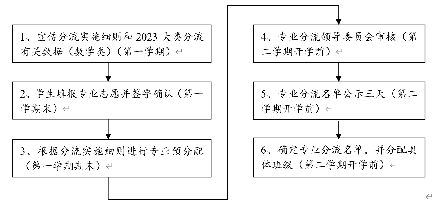 数学类专业分流工作从大一第一个学期末开始(具体时间以本科生院的通知为准),流程如下: